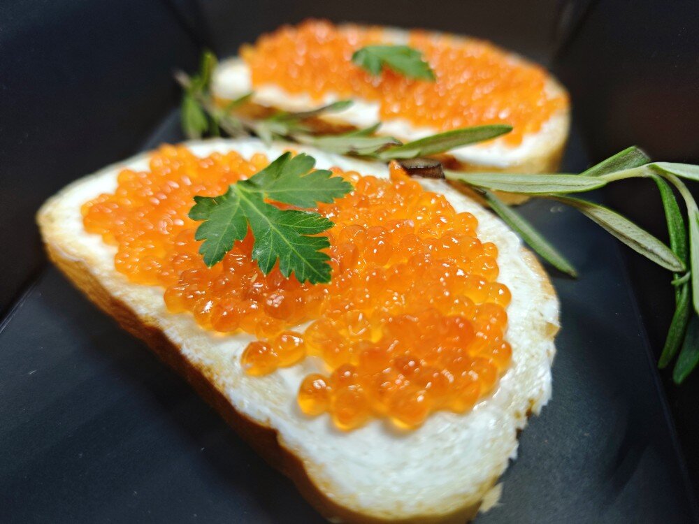 Батон белый нарезной поджаристый, масло ( лайм и авокадо), икра красная ( горбуши), зелень