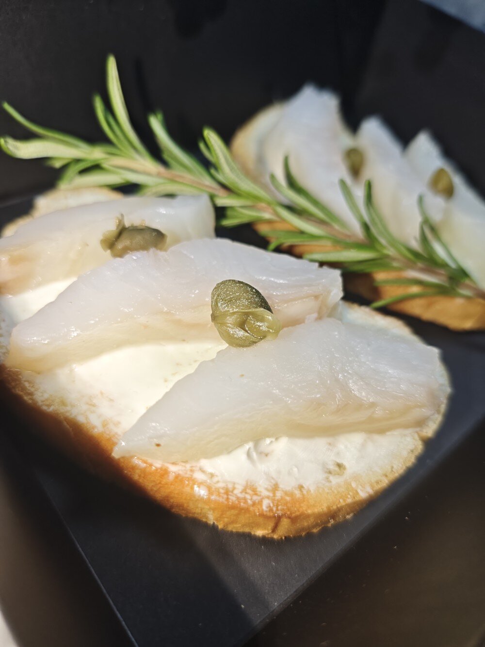 Поджаристый белый хлеб, масло авокадо-лайм, палтус слабосолёный, каперсы.